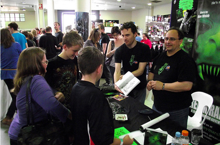 He has had book store and event sell outs from new readers discovering him at the event itself, being drawn in by the eye-catching colour branding across his booth, tables, swag and of course himself. I’ve attended his events seeing people approach and mentioning they’ve recognised the ‘green colouring‘ from across the hall, in the newspaper or online. He also wears a t-shirt that has an intriguing green and black symbol on it, which always sparks curiosity, which then leads to book sales.